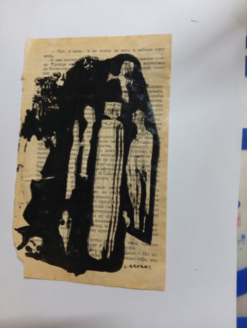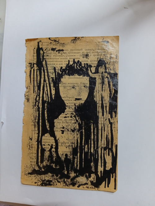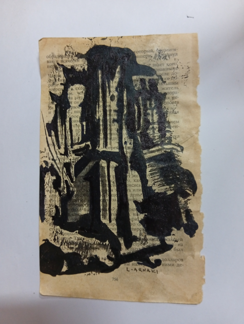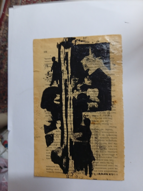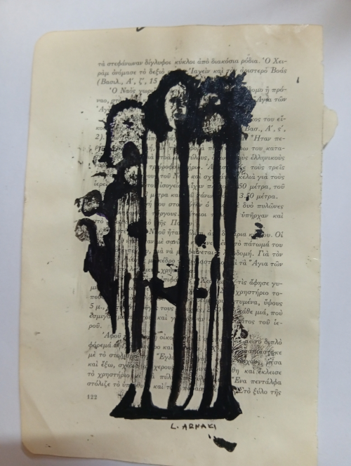 πρόσωπα, πορτρέτα, έργο μέσα από διάφορα υλικά: καμένες εφημερίδες, χαρτόνι, άμμος, κόσκινα, σάκοι,