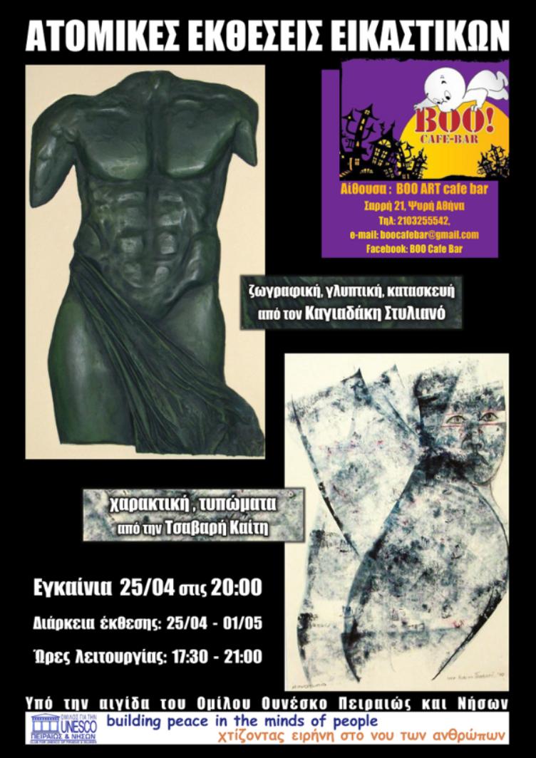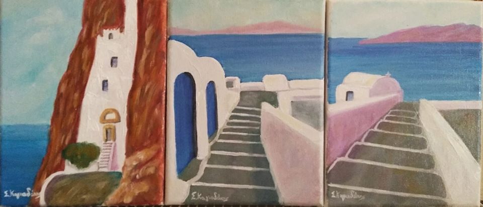 του Ομίλου Unesco Πειραιώς και Nήσων. Σήμερα ζεί στη Σαλαμίνα όπου διατηρεί και το εργαστήριο του. Ατομικές εκθέσεις: 1)Action art – Πειραιάς 04/2006 2)Δημαρχείο Σαλαμίνας – 07/2014 3)Boo art gallery – Ψυρή Αθήνα 04/2015 4) Πολιτιστικός Σύλλογος <<Καλλιτεχνόραμα>> – Γλυφάδα 5/2016 5) Πολιτιστικός Σύλλογος << Οδυσσέας Ελύτης>> – Σίκινος 08/2016 6) Πολιτιστικός Σύλλογος << Σαραντάρης Γιώργος >> – Σίκινος 08/2017 7) Εταιρία RAC sa – Πειραιάς 12/2017 8) Δήμος Υδρας <<Αίθουσα τέχνης Μελίνα Μερκούρη>> – Ύδρα 7/2018 9) Δήμος Νότιας Κυνουρίας <<Πύργος Τσικαλιώτη>> – Λεωνίδιο 4/2019 10)Δήμος Πόρου <<Κτίριο Συγγρού>> Πόρος 7/2019 11) Δήμος Τήνου 《Πνευματικό Κέντρο Πανόρμου Γιαννούλης Χαλεπάς》7/2021 KAGIADAKIS STYLIANOSHe was born in Piraeus in 1967 and grew up in Salamis. He began his visual journey in 1999, setting up paintings from various materials such as copper, clay, and wood, following his own teaching method. He has studied paintings at the Unesco Piraeus and Islands Laboratories, by the Bali sisters. He then attended sculpture and painting courses by the sculptor Moustapha Allous, as well as various painting techniques next to painter Stavros Bouranis. He has made 8 solo exhibitions and has participated in more than 80 group exhibitions in Athens, Piraeus and others. He is Vice President of the Dioni Artists Association, has served as General Secretary of the Salamis Island Insider Group and member of the Unesco Piraeus and Islands Group. Today he lives in Salamis, where he maintains his workshop.
